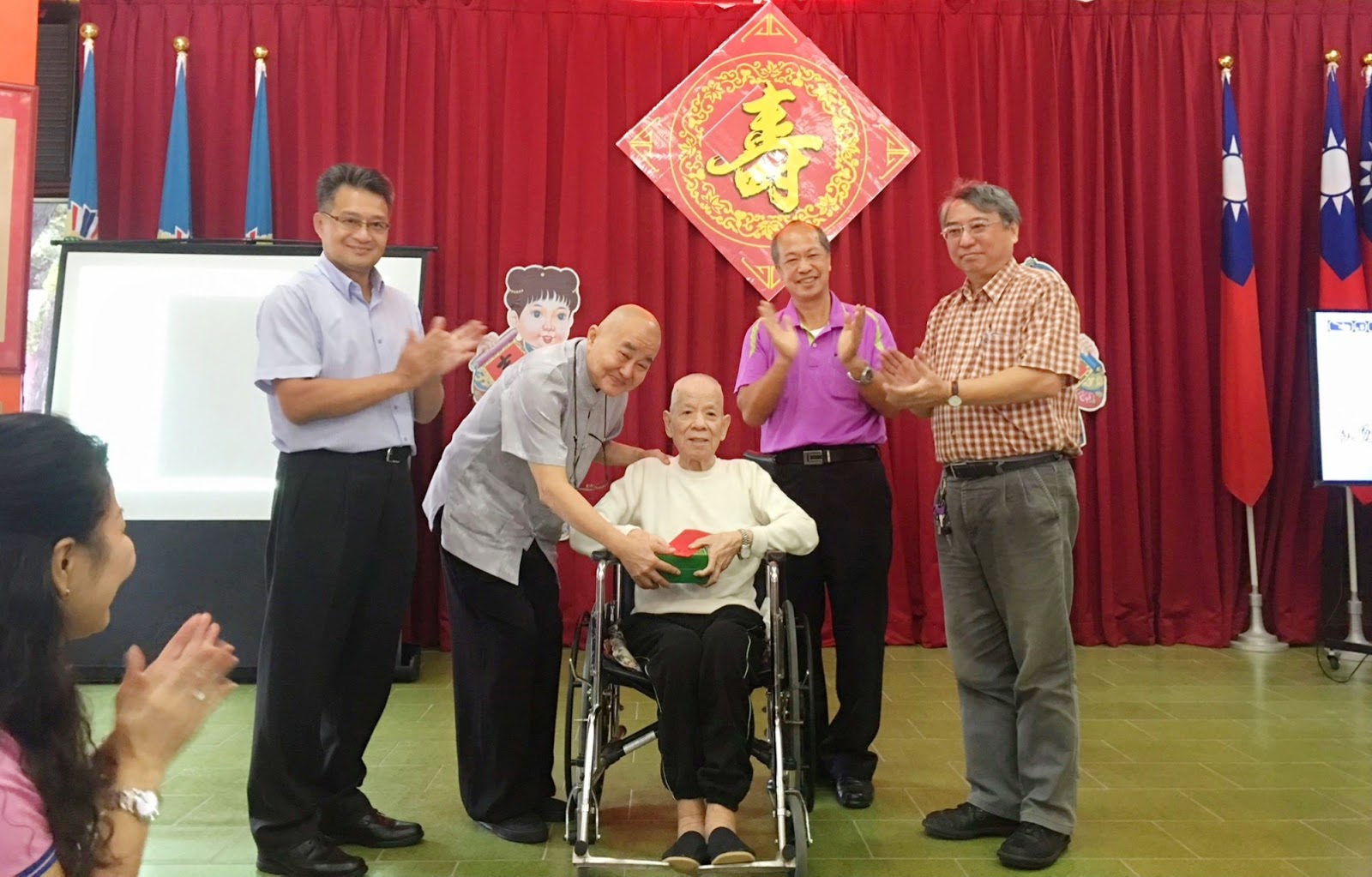 佳里榮家也特地安排百歲住民潘立國伯伯,偕同80歲以上及90歲以上榮民長輩各6名,上台代表佳里榮家榮民長輩接受善緣慈善會致贈的慰問金,收到賀禮與眾人的祝福,榮民長輩們享用著甜蜜蜜的糕點,臉上洋溢著幸福微笑。