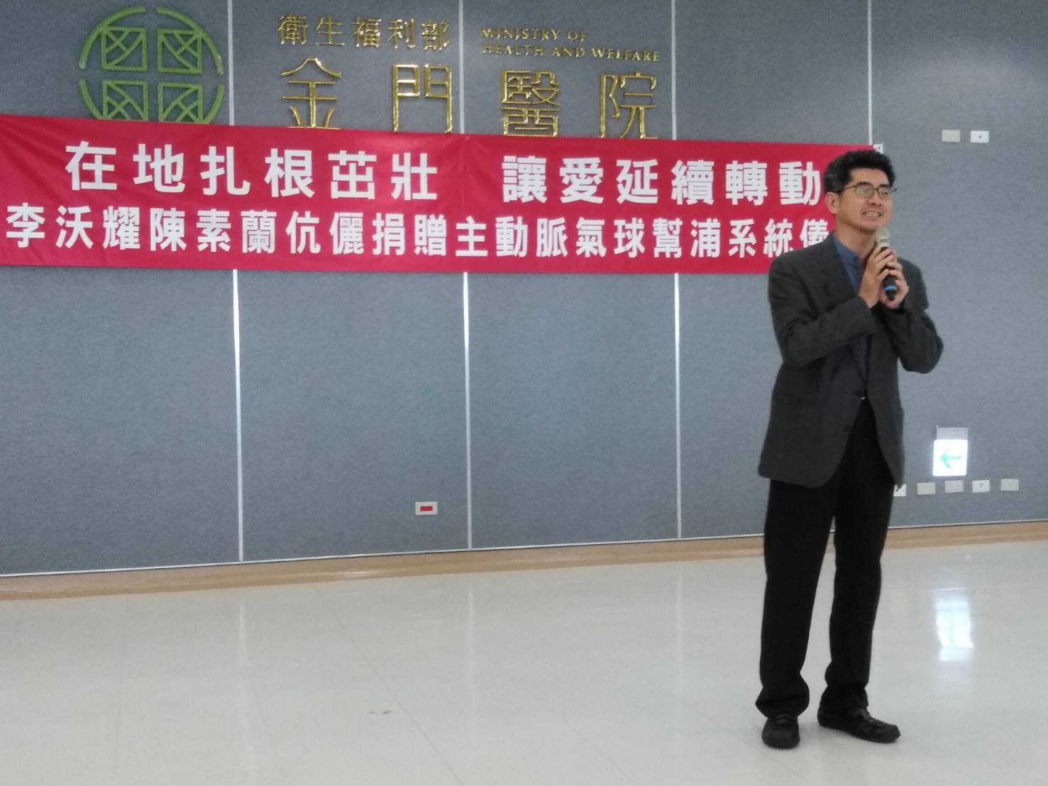 環遊國際旅行社董事長李沃耀、陳素蘭伉儷率臺灣公司員工30多人到金門醫院一起同喜;金醫週邊正是李沃耀兒時生長求學地方,於捐贈致詞時憶起兒時情境,頗有感觸。李沃耀表示,金門醫院當年只是所衛生所而已,許多家人孩子都於此接生,在金門成長,事過境遷,如今孩子都長大,有的也回到金醫服務,生生不息,無限感念;由於上個月,從報端看到有位金門鄉親因心肌梗塞後送臺灣治療,卻因為可以保命的主動脈內氣球幫浦,機型過大,無法隨人登機保命飛臺治療,內心便不斷琢磨這問題如何改善?便主動和院方聯繫,在副院長李錫鑫提示而得知,現有新型輕巧的主動脈內氣球幫浦,價值臺幣240多萬元,是目前最廣泛且最簡單就能使用的輔助循環系統。