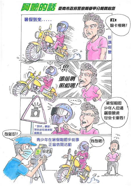 另外在暑假期間學甲警為了守護菁菁學子的交通安全,將針對容易危害青少年安全的駕駛行為,包括競速、超速等危險駕車行為加強稽查取締,此外,學甲警的漫畫高手交通組警員陳育嶙也以漫畫的方式來宣導青少年朋友在暑假期間不要危險駕車,多從事正當休閒活動,安全度過一個快樂的暑假。