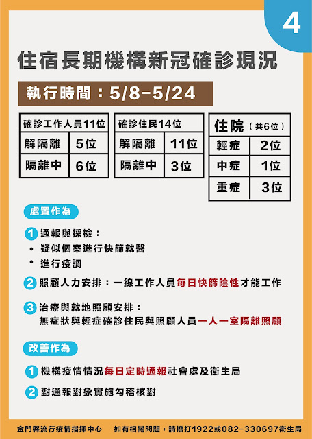 (1)自5/8~5/24為止,確診住民共有14人、解隔11人、隔離中3人;確診工作人員11人、解隔5人、隔離中6人。