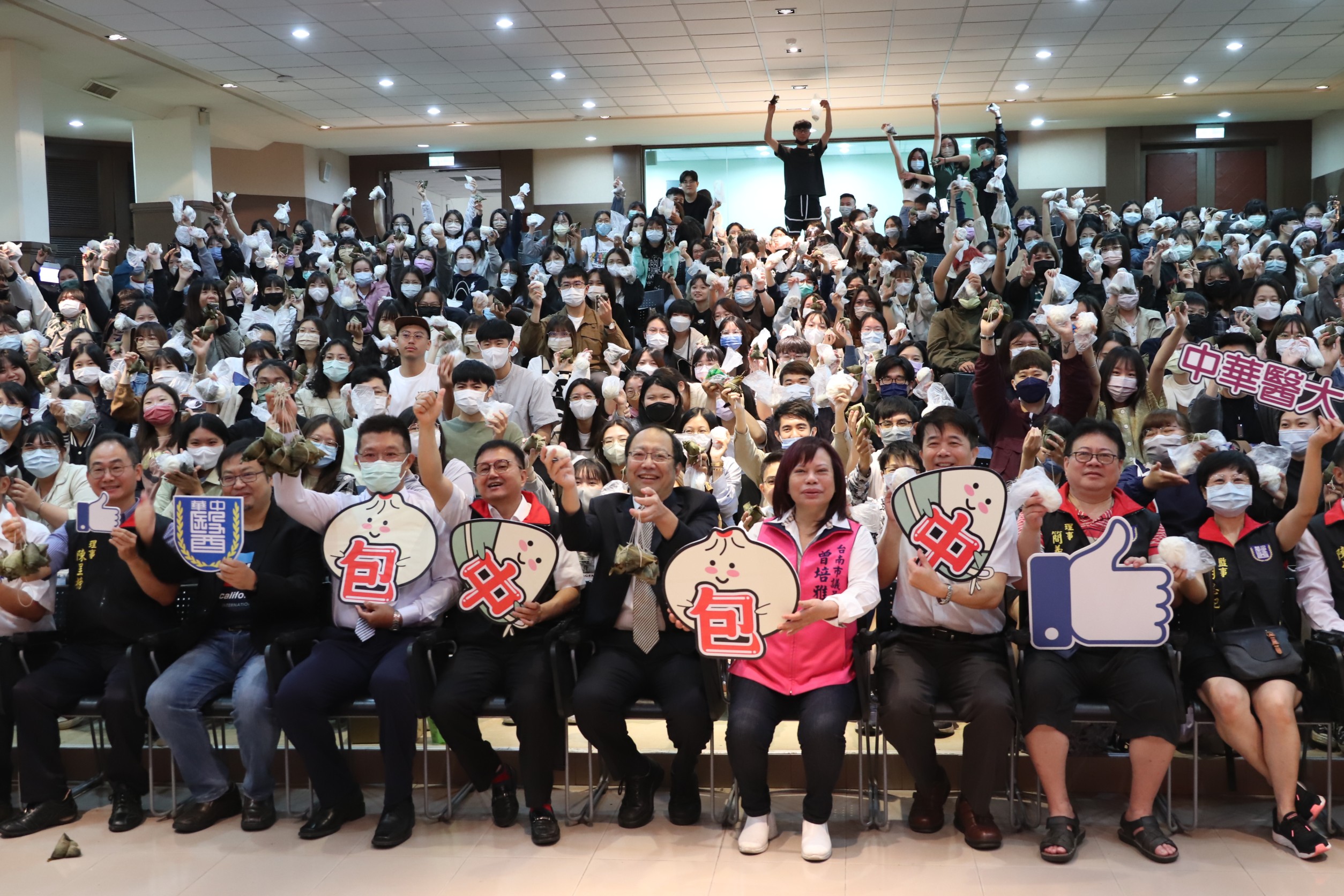 華醫家長會長及台南市校友會會長邱慈意與兩會理監事幹部們,協助發送包子和粽子同時,也向學生喊話鼓勵「全體包中all pass!國家考試加油!學生們收到包子和粽子開心道謝,並和師長齊聲高喊「國家考試包中過關」!