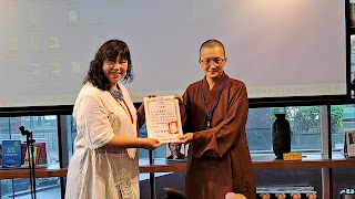 戴羽禎分享說,茶香千里相伴一世《四五年級返校日 拾起童心茶會》,她以《六式泡茶法介紹》分享與會大家,因為我們都是擺渡人,您知道古時候最有福報工作是什麼嗎?是擺渡的人;因為他們把人們從一個地方,平平安安的送到另一個地方,不論之後,等著 那些人們的是幸運或是悲傷,能平安到達,才能有一個好的開始;「千江有水千江月,萬里無雲萬里天」;此次所有茶會茶事主辦總召及幕後工作人員,都是無冕王,都是低首下心、實誠厚道的文化擺渡人,感恩所有手心向下的人們;這次活動,非常感恩總召黃皓雲常務理事自行準備桌子,和從老叢茶圃,帶來6種茶具,親力親為。