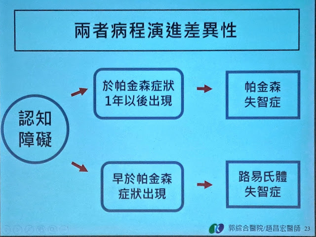 趙昌宏醫師指出,路易氏體失智症和帕金森失智症,兩者在病理上,源頭相同只是症狀展現順序不同:路易氏體失智症為大腦先受損,因此認知功能退化較早;帕金森失智症為腦幹先受損,出現動作障礙較早,起點不同,但最終的結果則是類似;路易氏體失智症和帕金森失智症和最大差異在於臨床症狀出現的時間不同,現在以1年來區分;即認知障礙出現於帕金森症狀1年以後,則屬帕金森失智症,如果認知障礙出現於帕金森症狀1年內或認知障礙出現早於帕金森症狀則為路易氏體失智症。