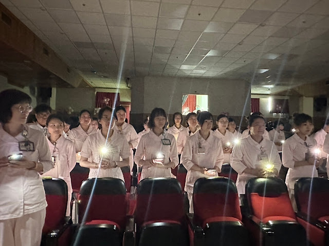 慶祝大會中重頭戲「傳光」儀式,由嘉灣分院護理部主任黄恵美將生生不息護理之光,交由副主任張蘭英及張凱玲,再逐一傳遞給督導、護理長及護理師們,代表使命傳承交付,用愛的燭光照亮病人,氣氛隆重溫馨。