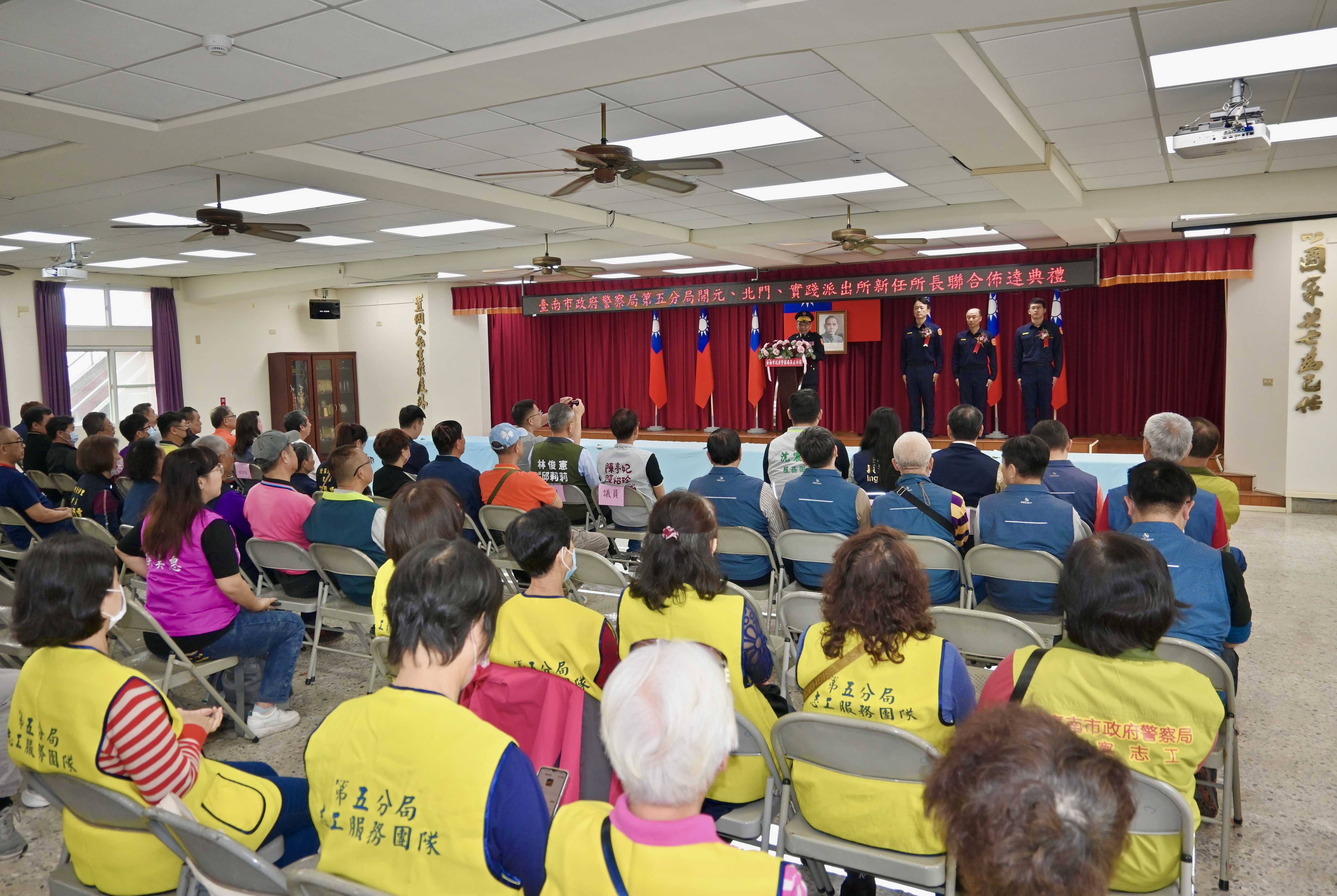 【記者于郁金/臺南報導】南警局第五分局開元、北門及實踐派出所新任所長佈達典禮,於14日上午10時在該分局4樓禮堂舉行,由分局長洪宏榮親自主持佈達,蒞臨貴賓有市議員蔡宗豪、議長邱莉莉秘書陳明才、市議員陳怡珍特助李介文、沈震東特助沈震南、周嘉韋主任王郁卉、穎艾達利特助陳雲雀,北區區公所主秘林禎輝及多名里長、警友、志工、義警及民防等到場觀禮,典禮簡單隆重;洪分局長除對新任所長榮膺新職表達祝賀外,同時對各位貴賓在百忙當中撥冗觀禮支持,表示由衷感謝。